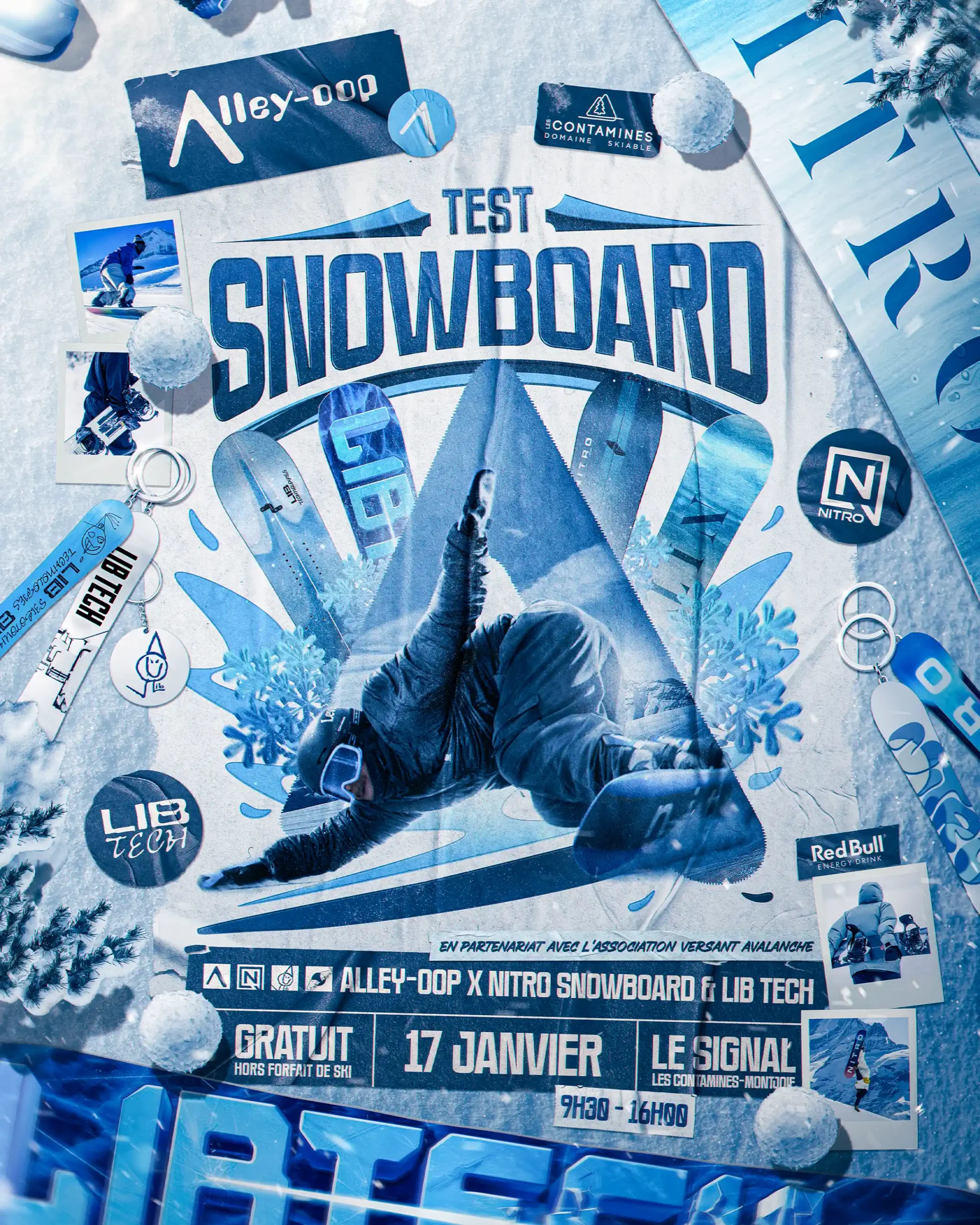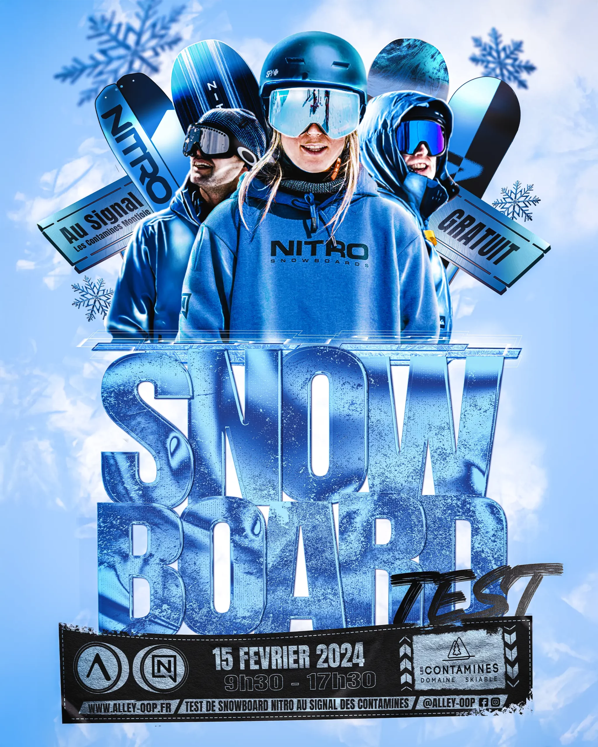 Official poster series for the brands NITRO SNOWBOARD, FACTIONS SKIS, and LIB TECH as part of snowboard tests and ski tests organized in collaboration with the town of Les Contamines-Montjoie in Haute-Savoie, France.