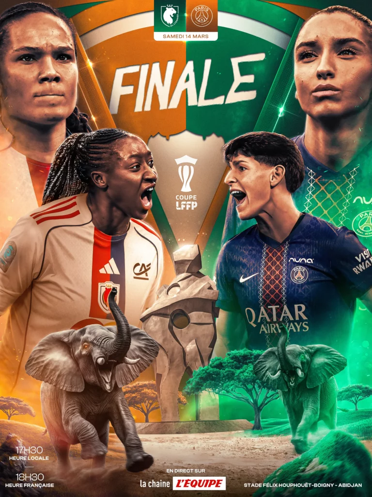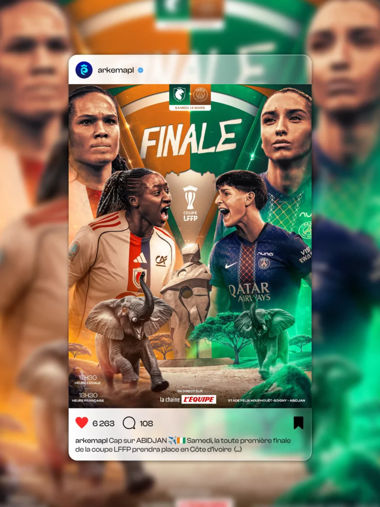 The main challenge for the champion visuals and the final visual was to incorporate references to the host country, Ivory Coast (flag colors, elephants, the Akwaba statue, etc.), while finding a harmonious balance with the players from the two finalist clubs, Olympique Lyonnais Women and Paris Saint-Germain Women. For the templates, the main objective was to deliver clear, ready-to-use visuals for community managers, while strictly adhering to the Arkema Première Ligue and LFFP’s graphic identity. It was also important to highlight the fact that the group stage was organized according to the geographical areas in which the clubs are located.