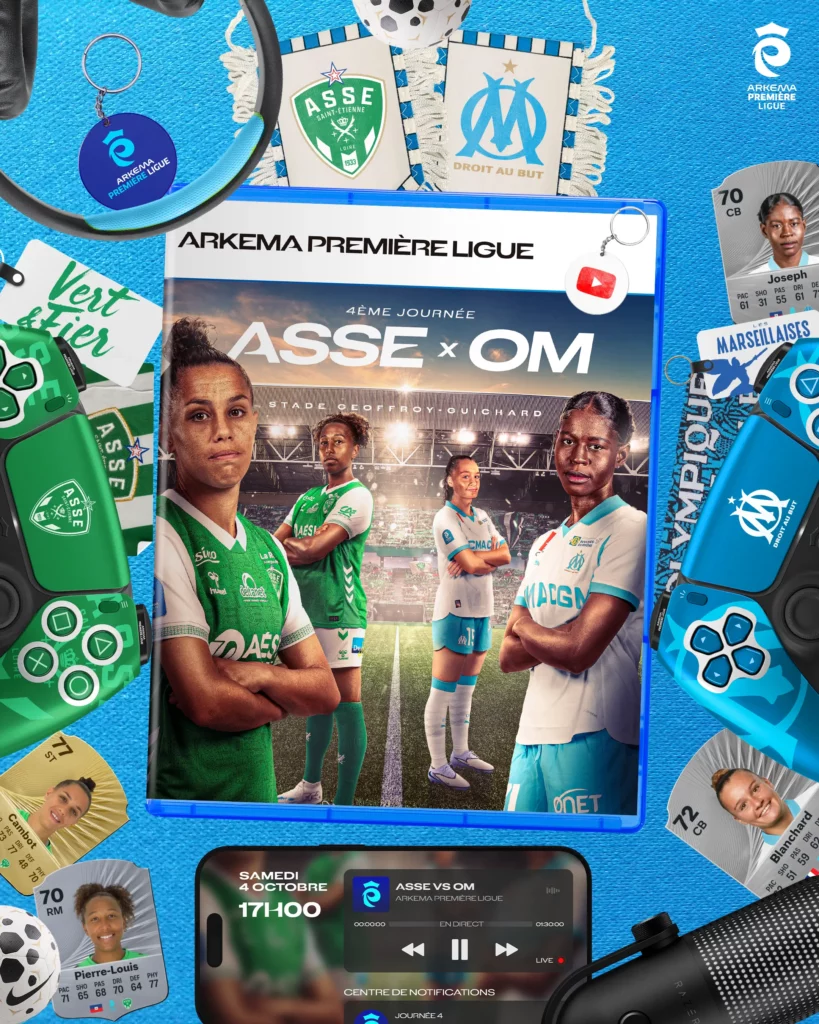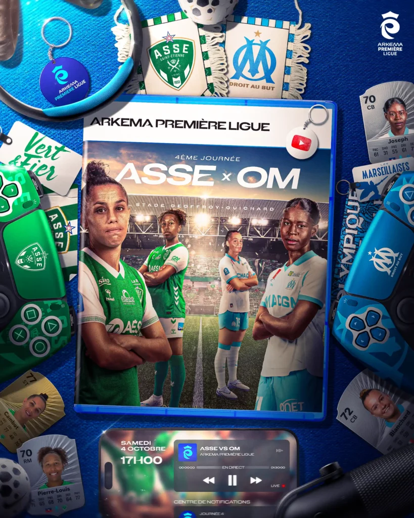 The idea behind the brief was to create a photo-manipulation–based visual referencing the video game FIFA 26 (released the same week as the match), while highlighting the rivalry between the two teams. To achieve this, the main element of the visual was a game case featuring a composition of selected players from both clubs inside the match stadium. The visual also includes game controllers in the teams’ colors, as well as FUT cards. All elements are set within a blue-toned palette, the dominant color of the Arkema Première Ligue’s visual identity.