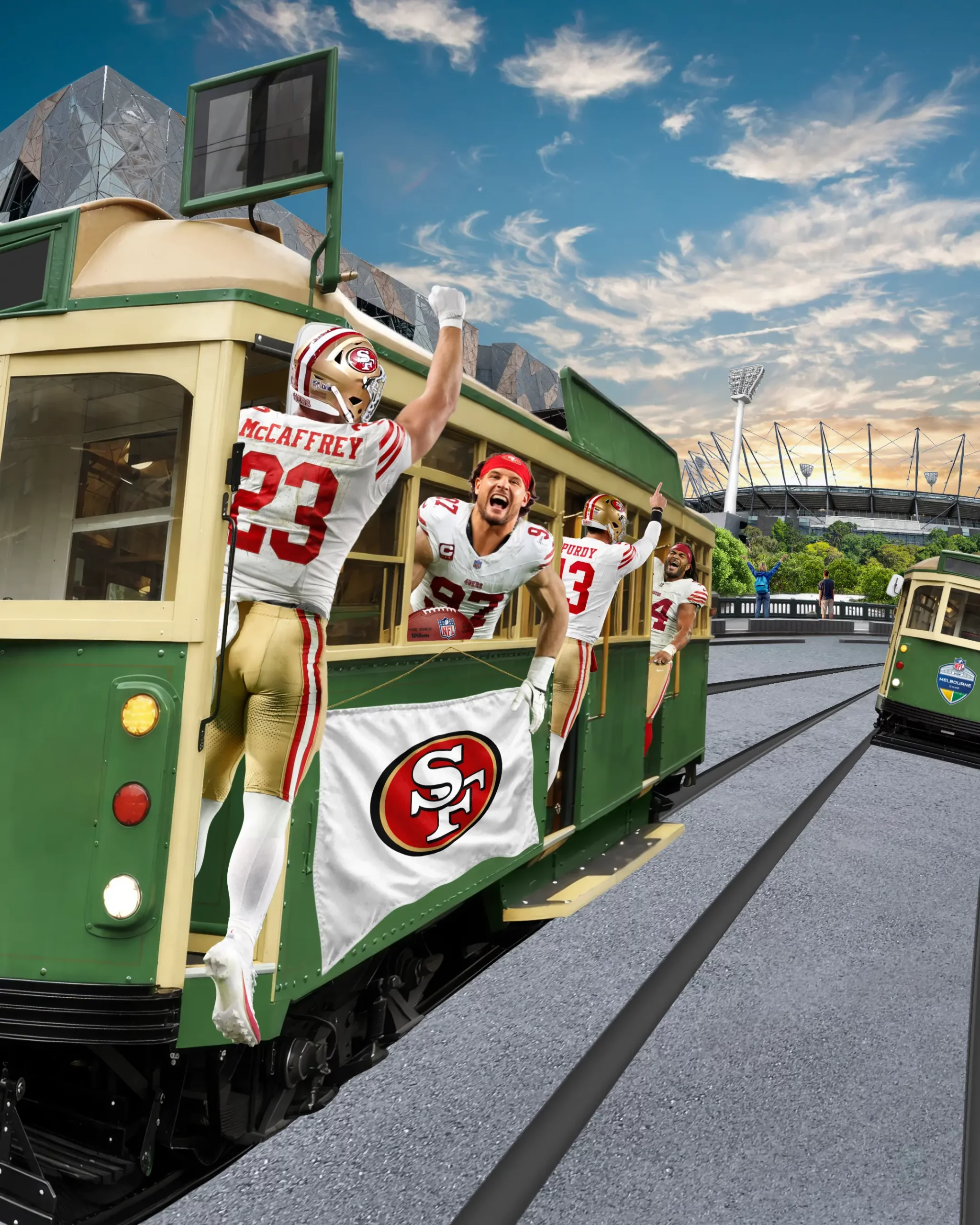 The idea behind the brief was to imagine a scene in which the 49ers players arrive in Melbourne aboard one of the city’s iconic trams, heading straight toward the Melbourne Cricket Ground, the city’s stadium. In the background, the Ian Potter Centre can also be seen, a major cultural symbol of Melbourne. Visually, the goal was to add a subtle touch of the 49ers’ colors (red, white, and gold) without overpowering the overall visual.