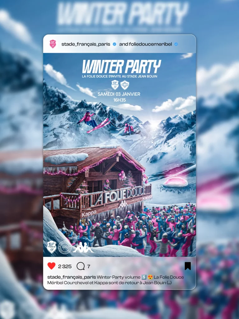 The main challenge of this project was to blend the universe and atmosphere of La Folie Douce (mountains, skiing, snow, chalet, festive spirit) with the club’s graphic identity (blue and pink), while highlighting the partner brand Kappa. The brief also required the subtle integration of Stade Français Paris’ stadium within the visual.