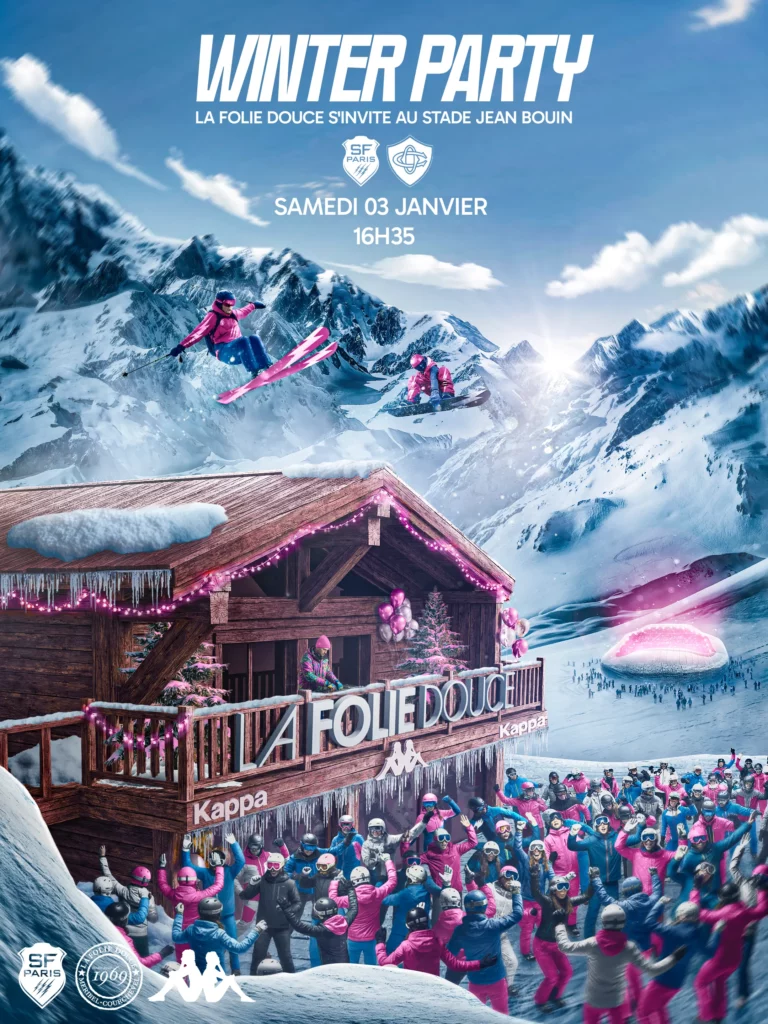Creation of a key visual and around ten adaptations (social media, print, ticketing) for the Stade Français Paris Winter Party, a major event held in partnership with Kappa and La Folie Douce for the 14th matchday of the Top 14. Project delivered via Samba Digital.